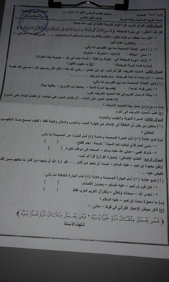 اسئلة اختبار التربية الاسلامية للصف الثانى الثانوى الفصل الدراسي الاول 2018 - ادراة نقادة قنا