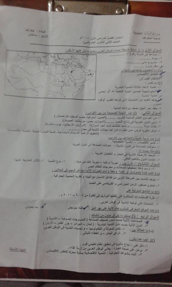 اسئلة اختبار نهائي لمادة الجغرافيا للصف الثانى الثانوى الفصل الدراسي الثاني 2018 - ادارة الدلنجات البحيرة