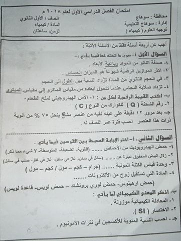 اسئلة اختبار الكيمياء الصف الأول الثانوي 2018 - الفصل الدراسي الأول - سوهاج