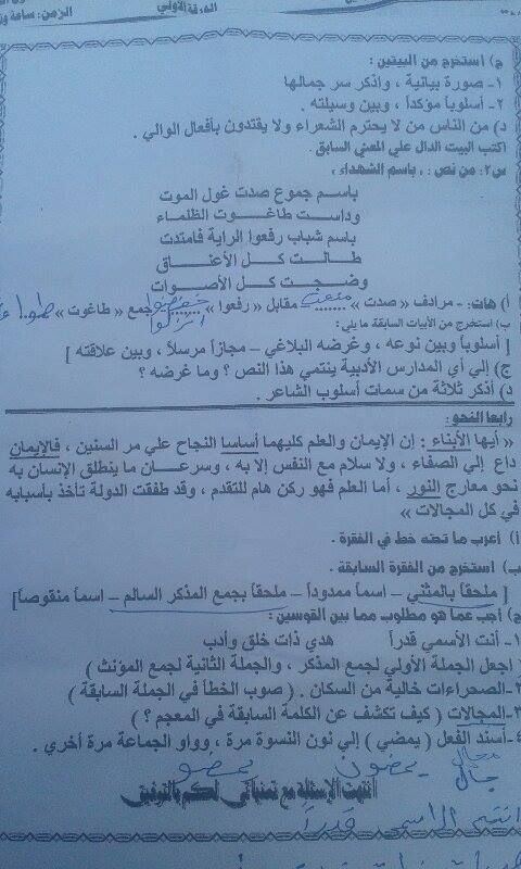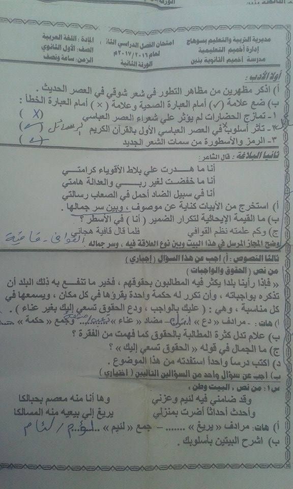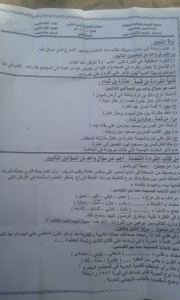 اسئلة اختبار اللغة العربية الصف الأول الثانوي 2017 - الفصل الدراسي الثاني - القاهرة