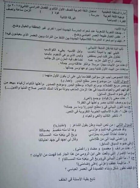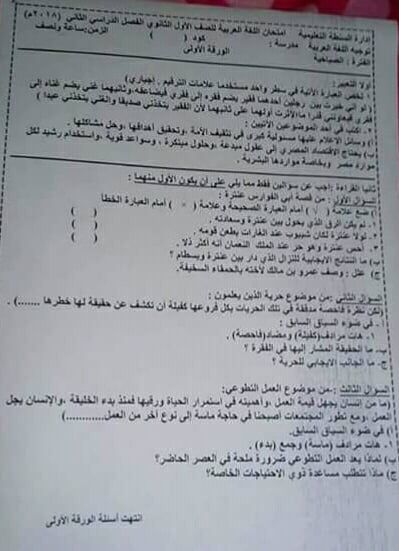 اختبار اللغة العربية الصف الأول الثانوي 2018 - الفصل الدراسي الثاني - الغربية.jpg