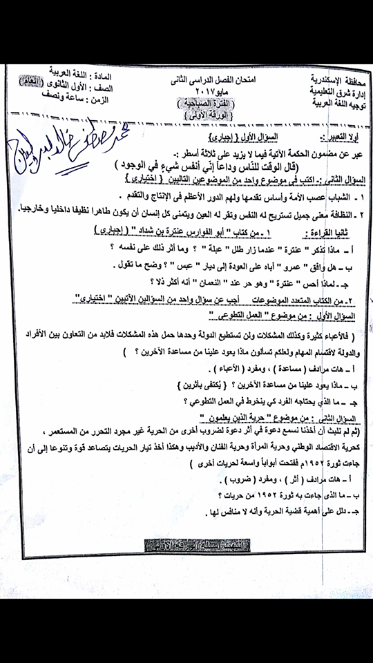 اختبار اللغة العربية الصف الأول الثانوي 2017 - الفصل الدراسي الثاني - الاسكندرية.png