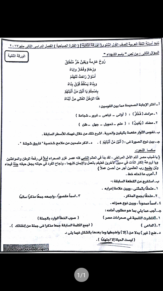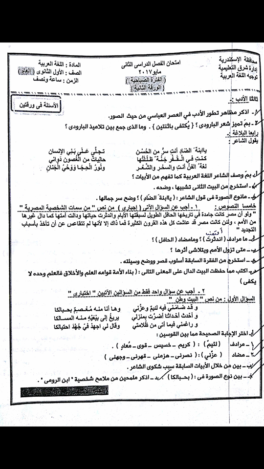 اسئلة اختبار نهائي  لمادة  اللغة العربية  للصف الاول الثانوى الفصل الدراسي  الثاني 2017-  شرق  الاسكندرية