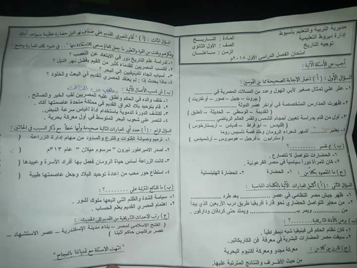 اسئلة اختبار التاريخ الصف الأول الثانوي 2018 - الفصل الدراسي الأول - اسيوط