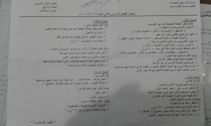 اسئلة اختبار نهائي لمادة التاريخ للصف الاول الثانوى الفصل الدراسي الثاني 2017- ادارة سنبلاوين - الدقهلية