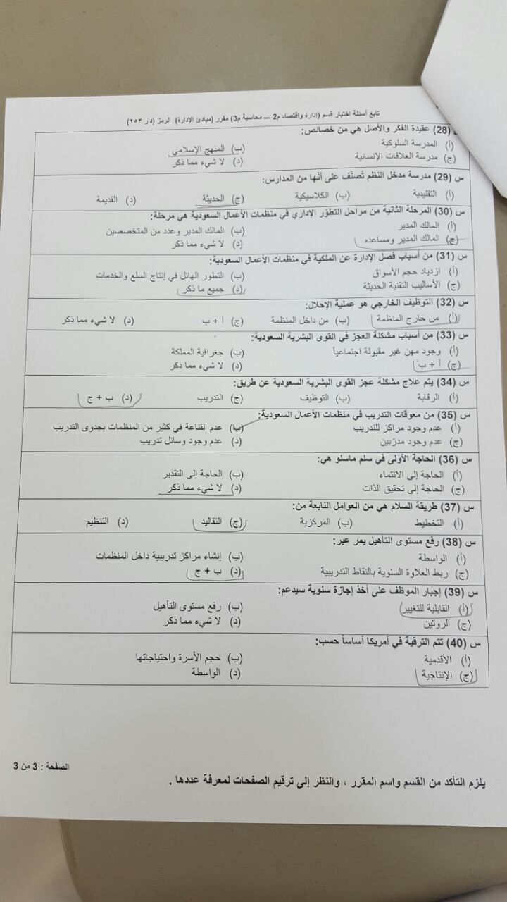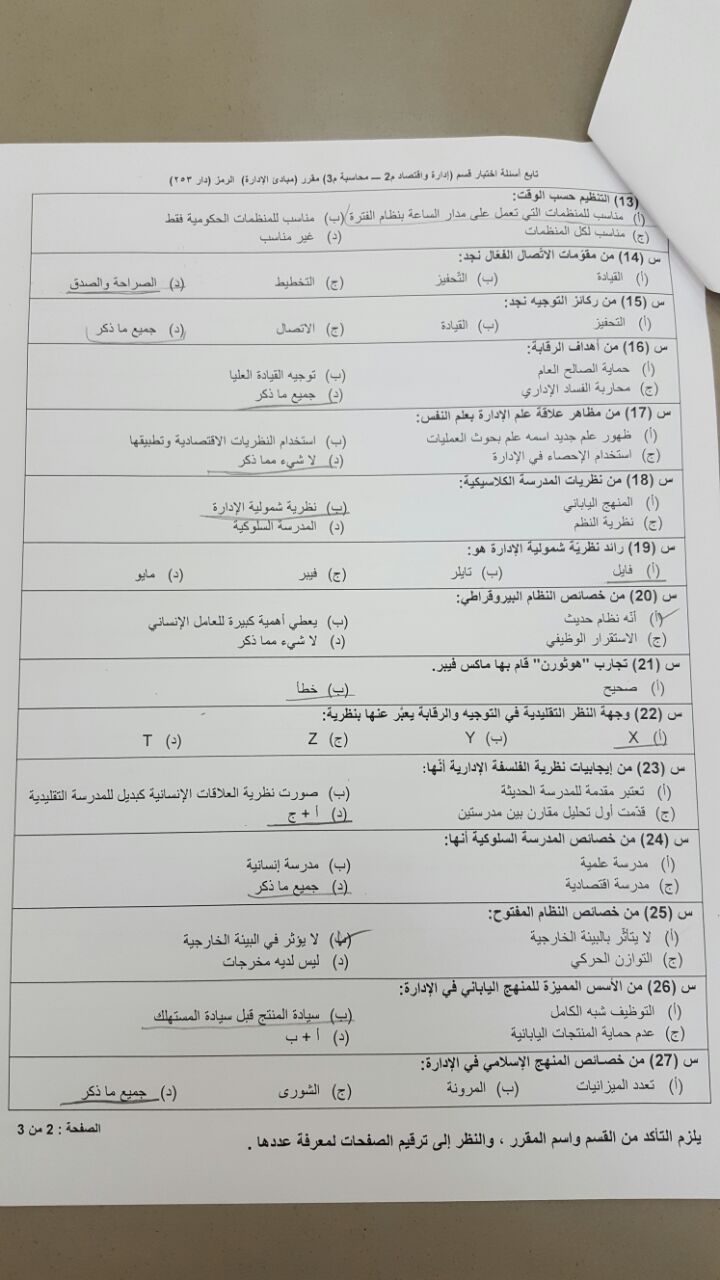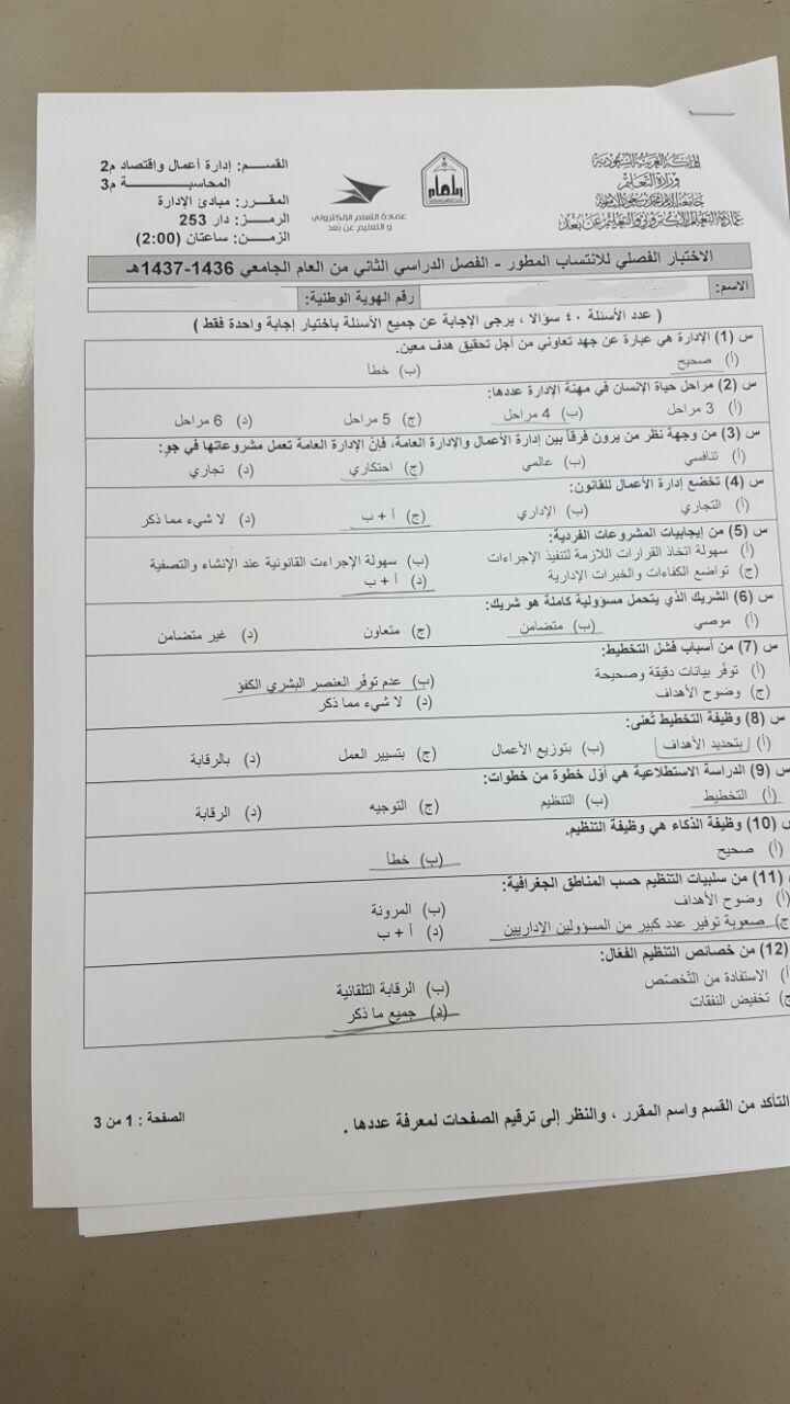 اختبار مبادئ الإدارة دار 253 الفصل الثاني 1437هـ جامعة الامام محمد بن سعود الاسلامية