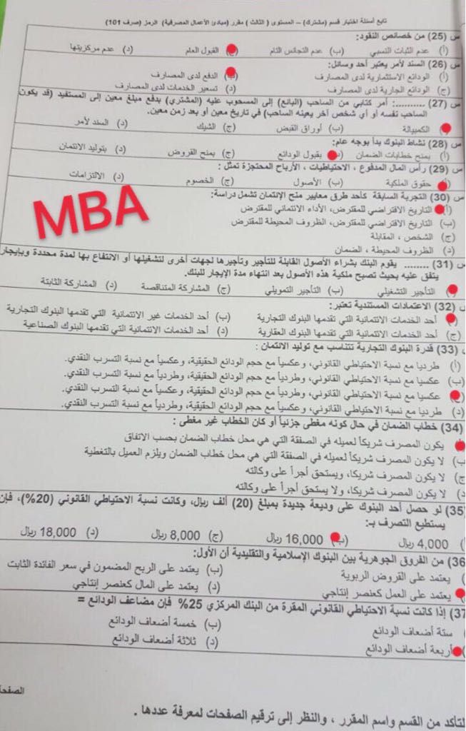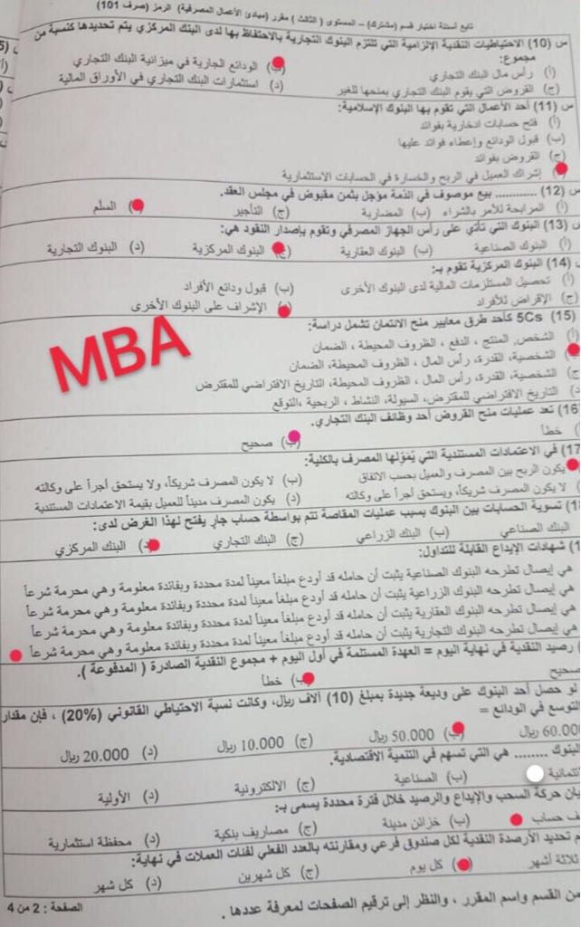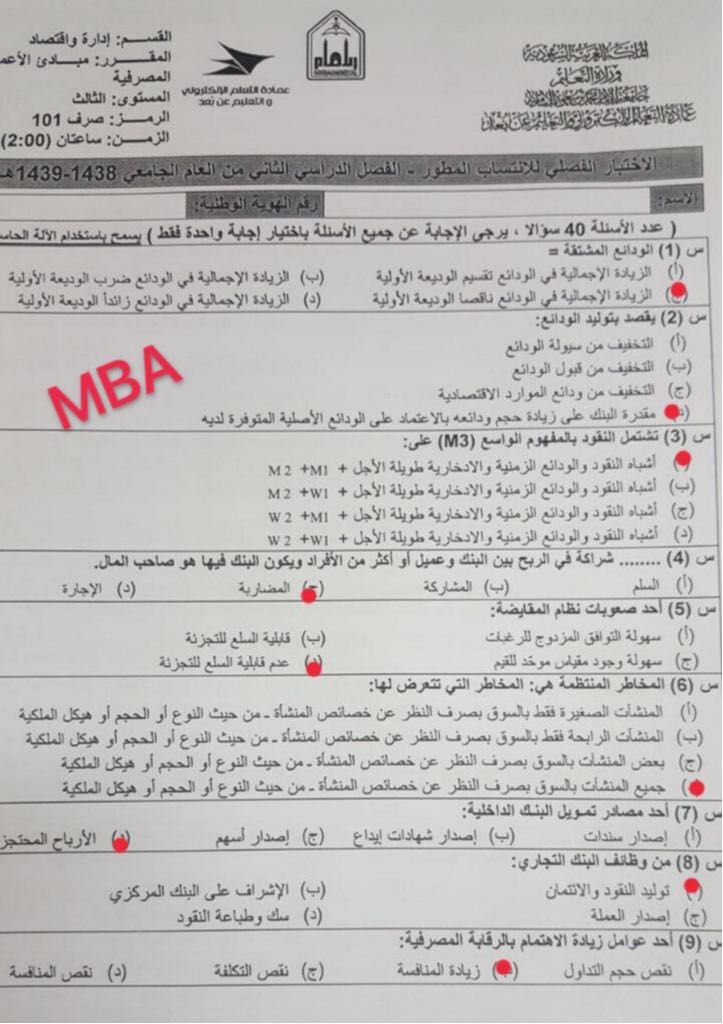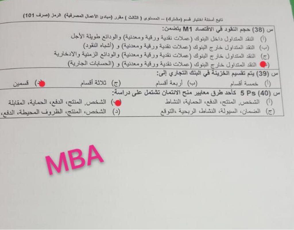 اسئلة مبادئ الأعمال المصرفية صرف 101 الفصل الثاني 1439هـ