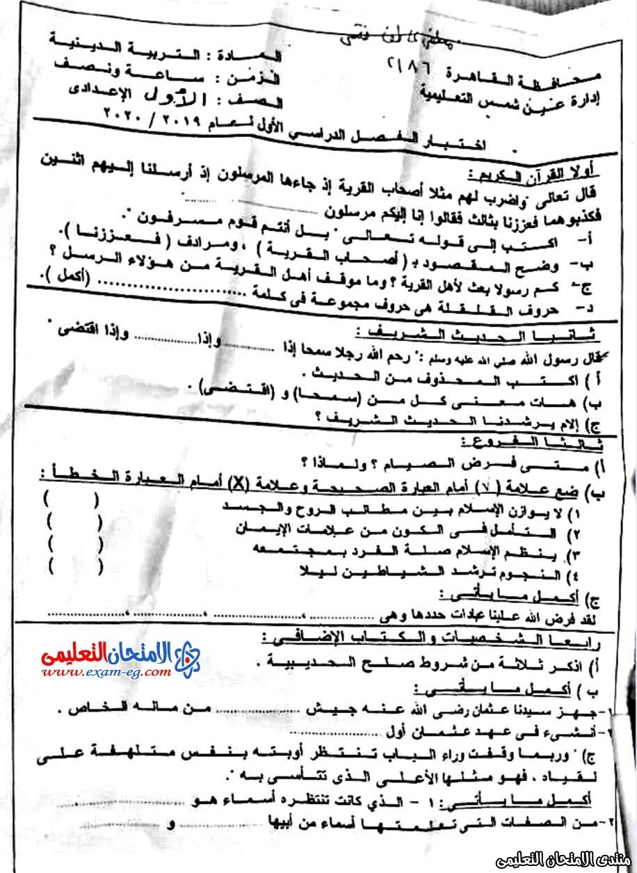 امتحان تربية دينية الاول الاعدادى ترم اول 2020 ادارة عين شمس