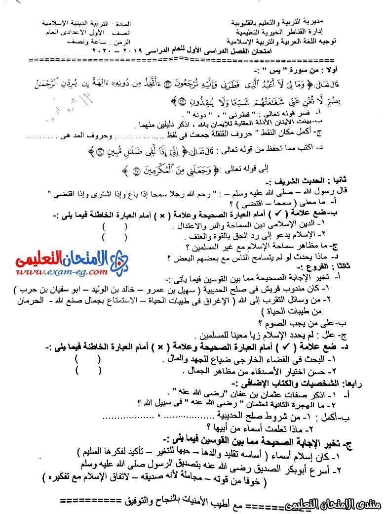 امتحان دين اسلامي اولى اعدادى الترم الاول 2020 شبين القناطر