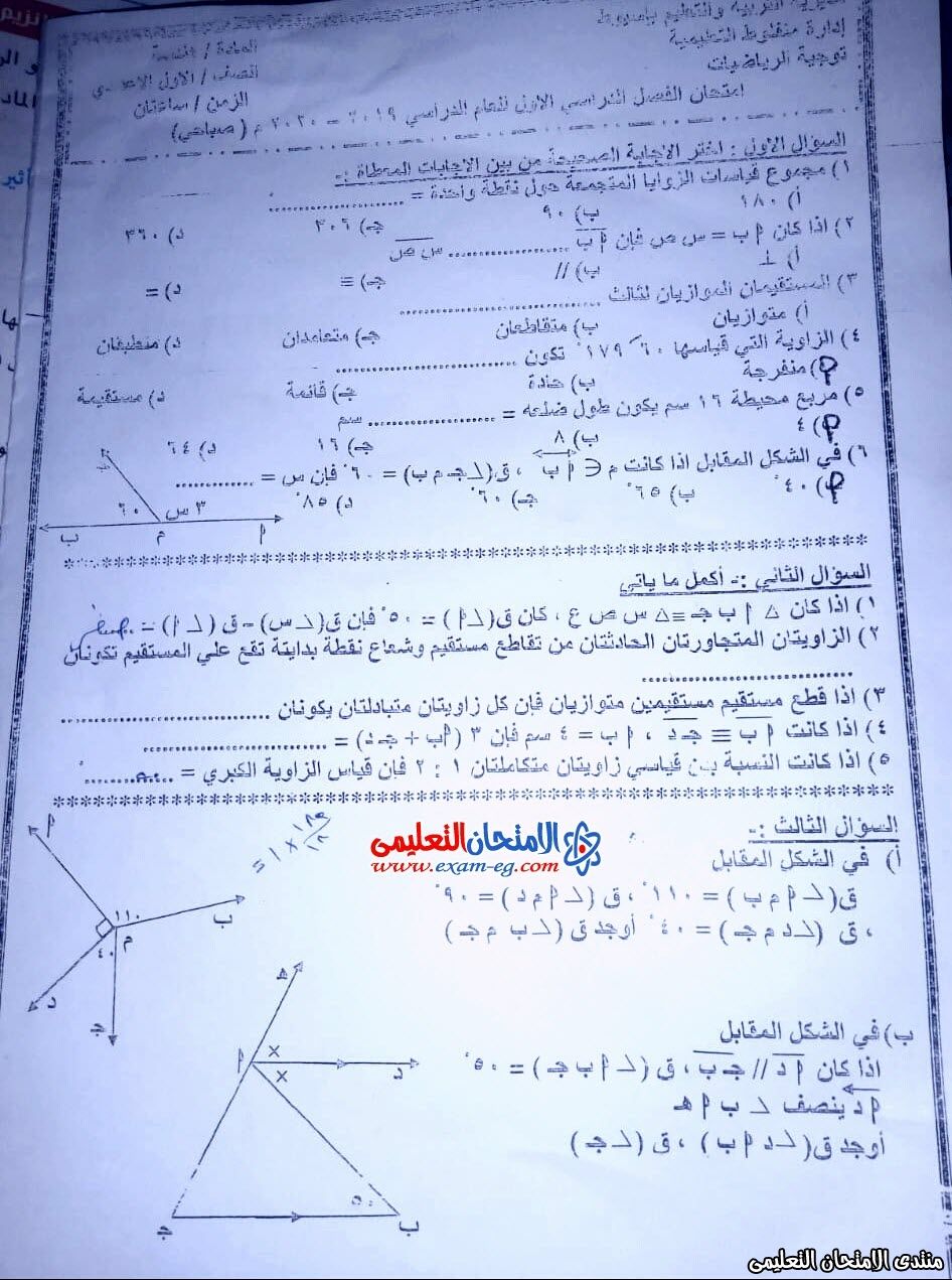 امتحان هندسة وقياس لاولى اعدادي الفصل الدراسي الأول 2020 ديروط باسيوط