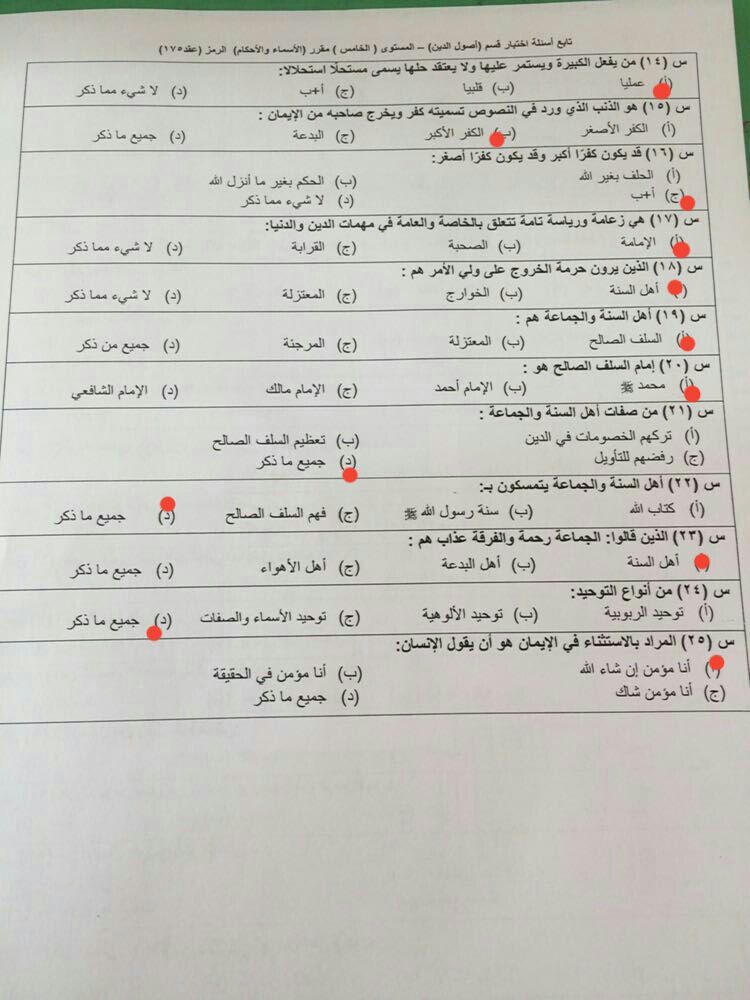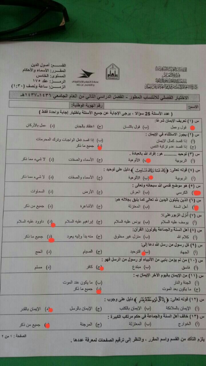 اسئلة اختبار الأسماء والأحكام عقد 175 الفصل الثاني 1437هـ