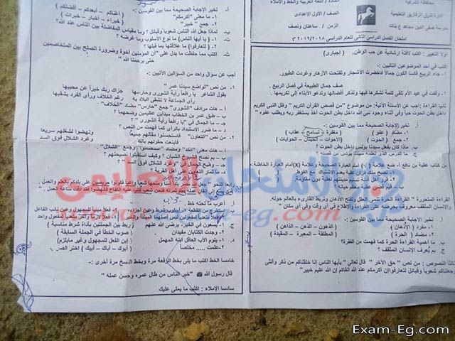 امتحان اللغة العربية للصف الاول الاعدادى الفصل الدراسي الثانى 2019 مدرسة صفى الدين