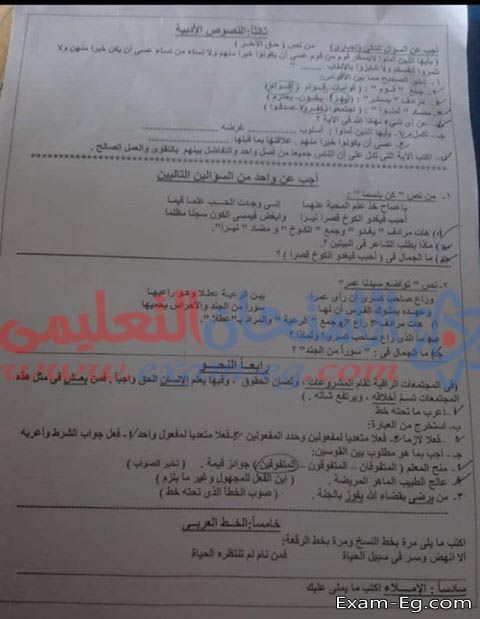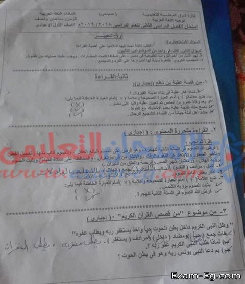 امتحان اللغة العربية للصف الاول الاعدادى الفصل الدراسي الثانى 2019 ادارة شرق المحله