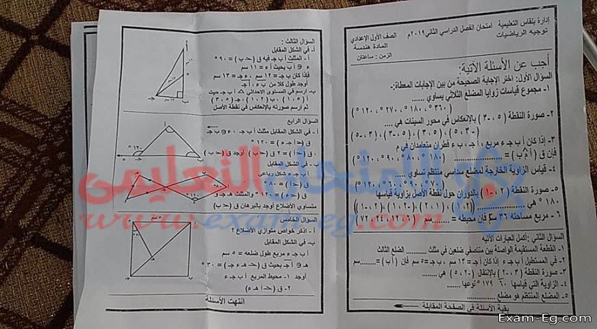 امتحان الهندسة للصف الاول الاعدادى الفصل الدراسي الثانى 2018 ادارة قها بالقليوبية