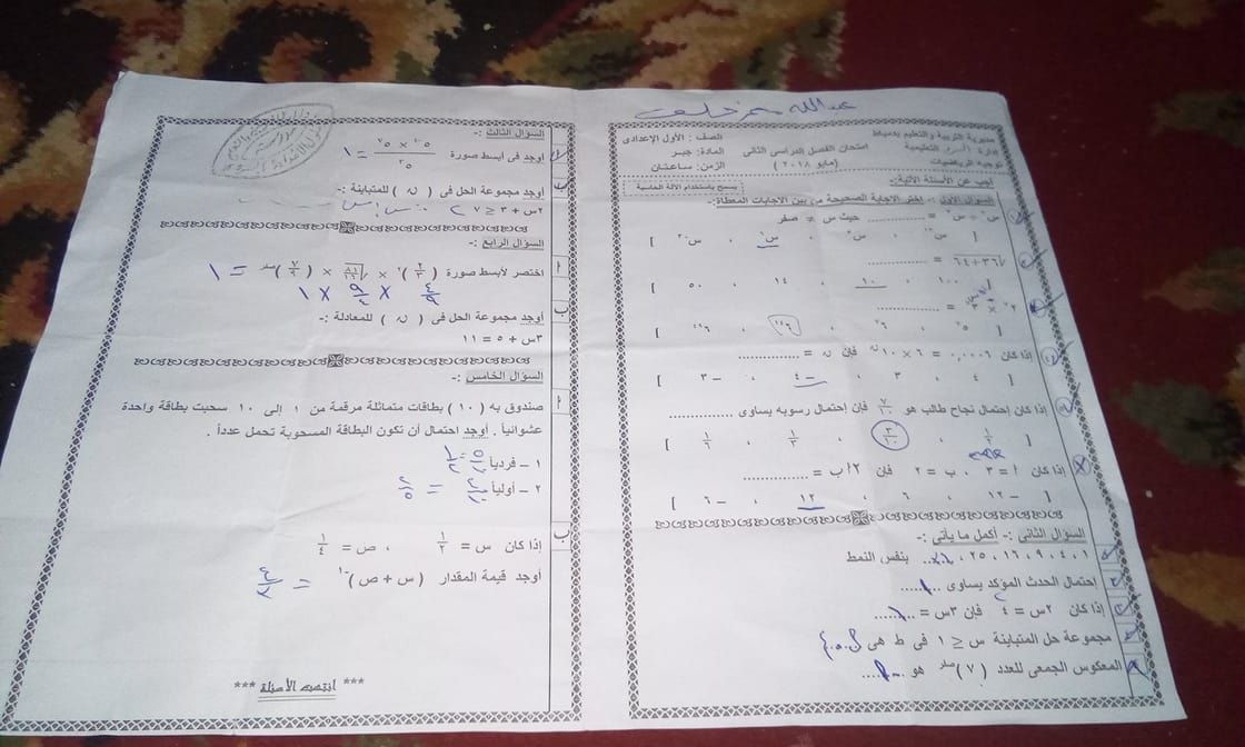 امتحان الجبر للصف الاول الاعدادى الترم الثانى 2018 ادارة السرو بدمياط