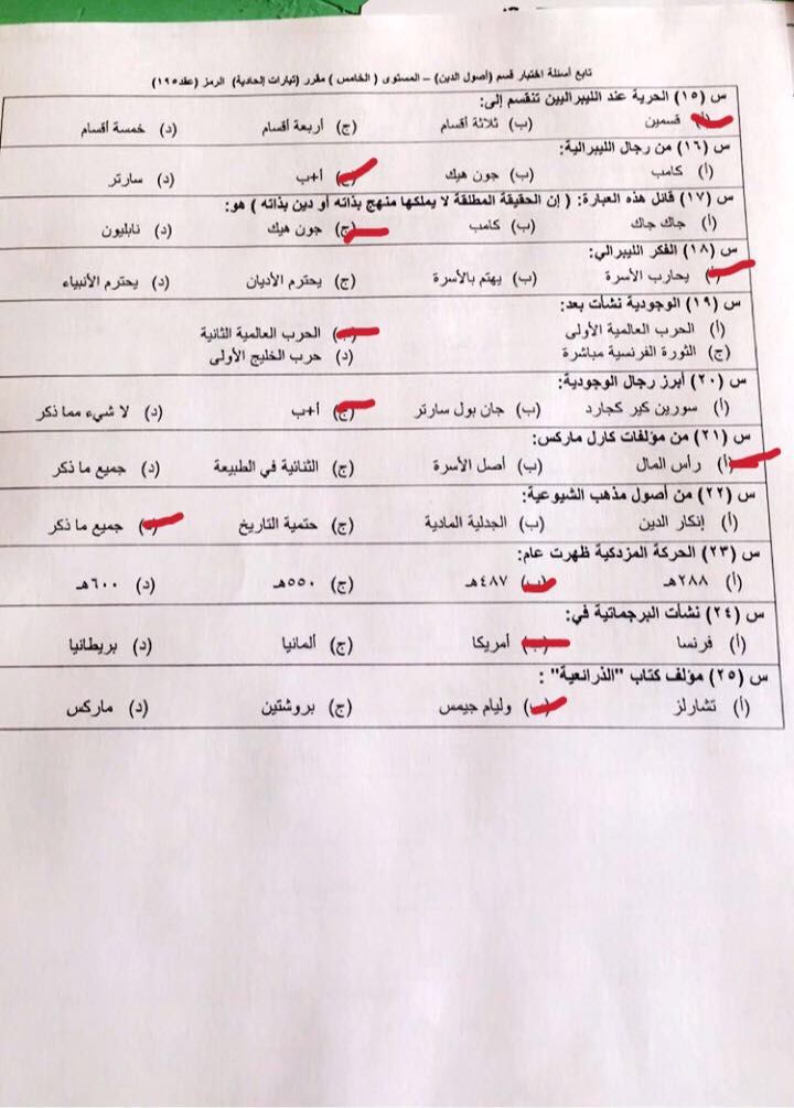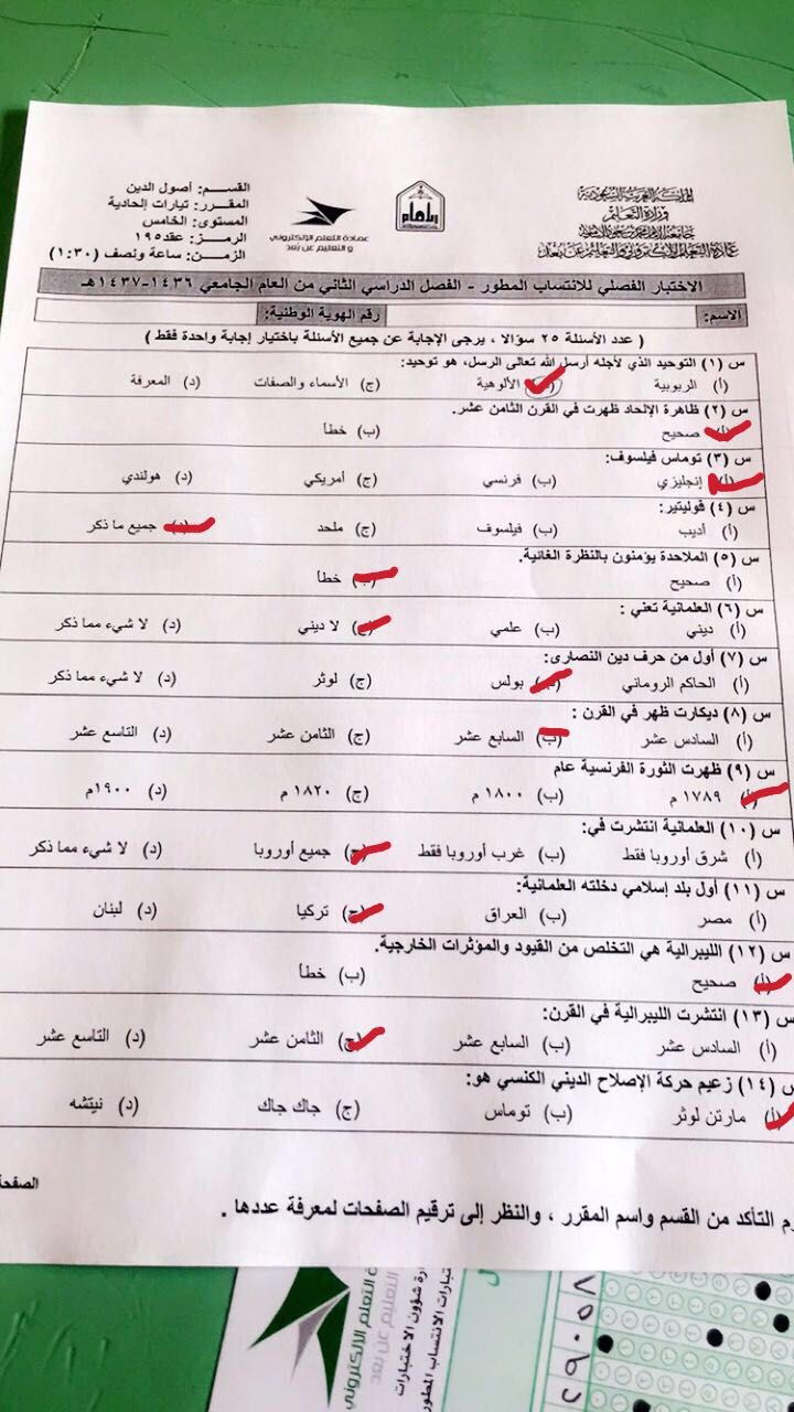 اختبار تيارات إلحادية عقد 195 الفصل الثاني 1437هـ
