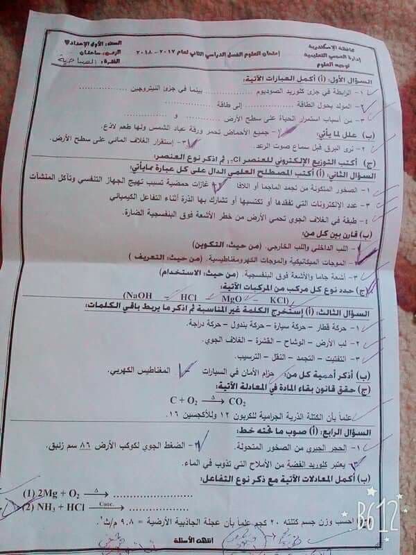 امتحان العلوم للصف الاول الاعدادى الفصل الدراسي الثانى 2019 ادارة العجمى