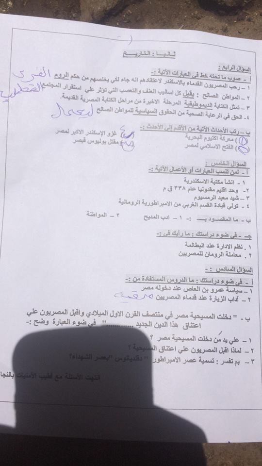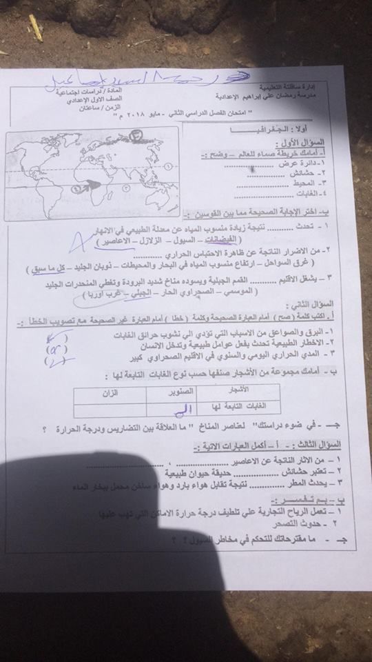 امتحان الدراسات الاجتماعية للصف الاول الاعدادى الفصل الدراسي الثاني 2018 ادارة ساقلتة بسوهاج