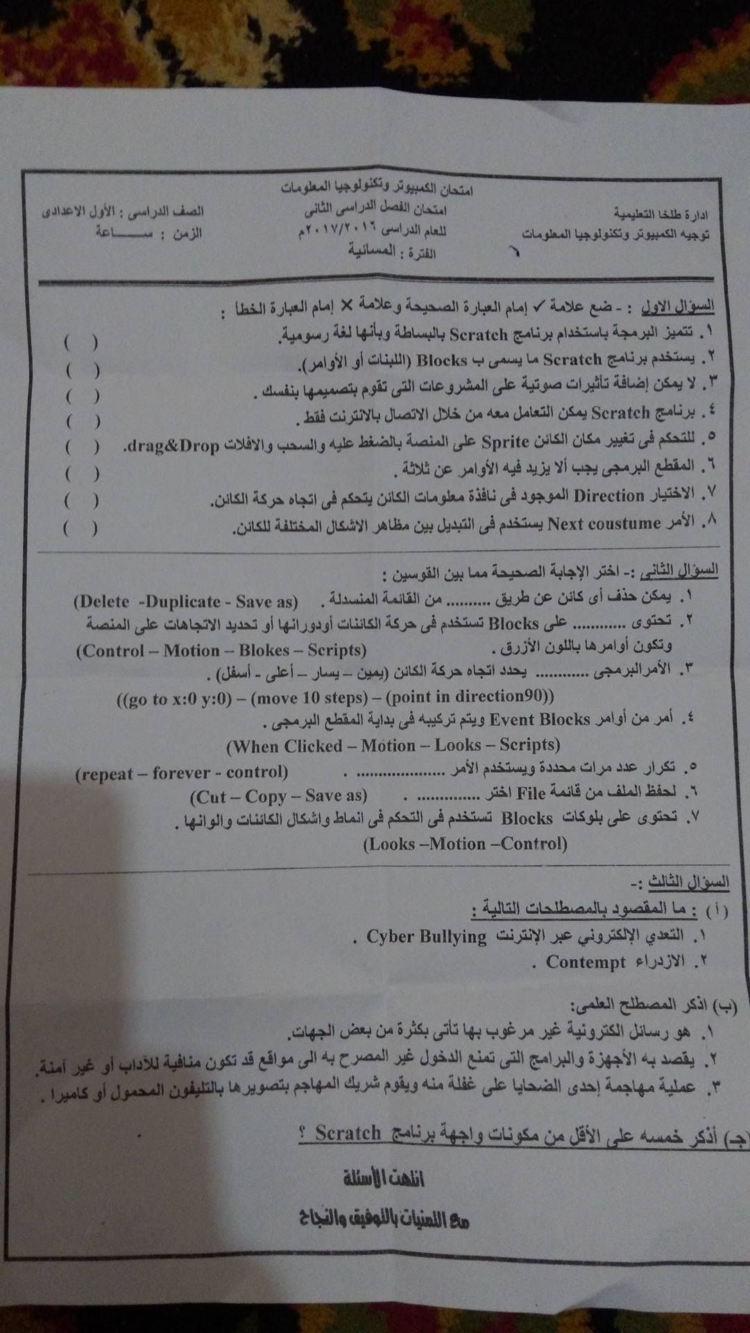 امتحان الحاسب الالى للصف الاول الاعدادى الفصل الدراسي الثاني 2017 ادارة طلخا بالدقهلية