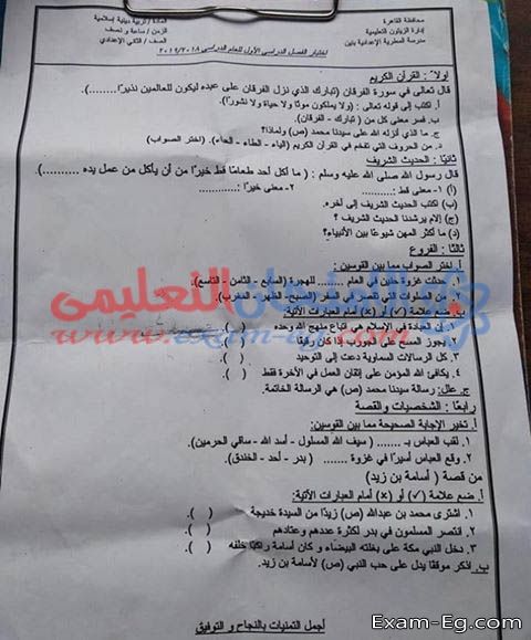 امتحان التربية الدينية للصف الثانى الاعدادى الفصل الدراسي الاول 2019 ادارة الزيتون بالقاهرة