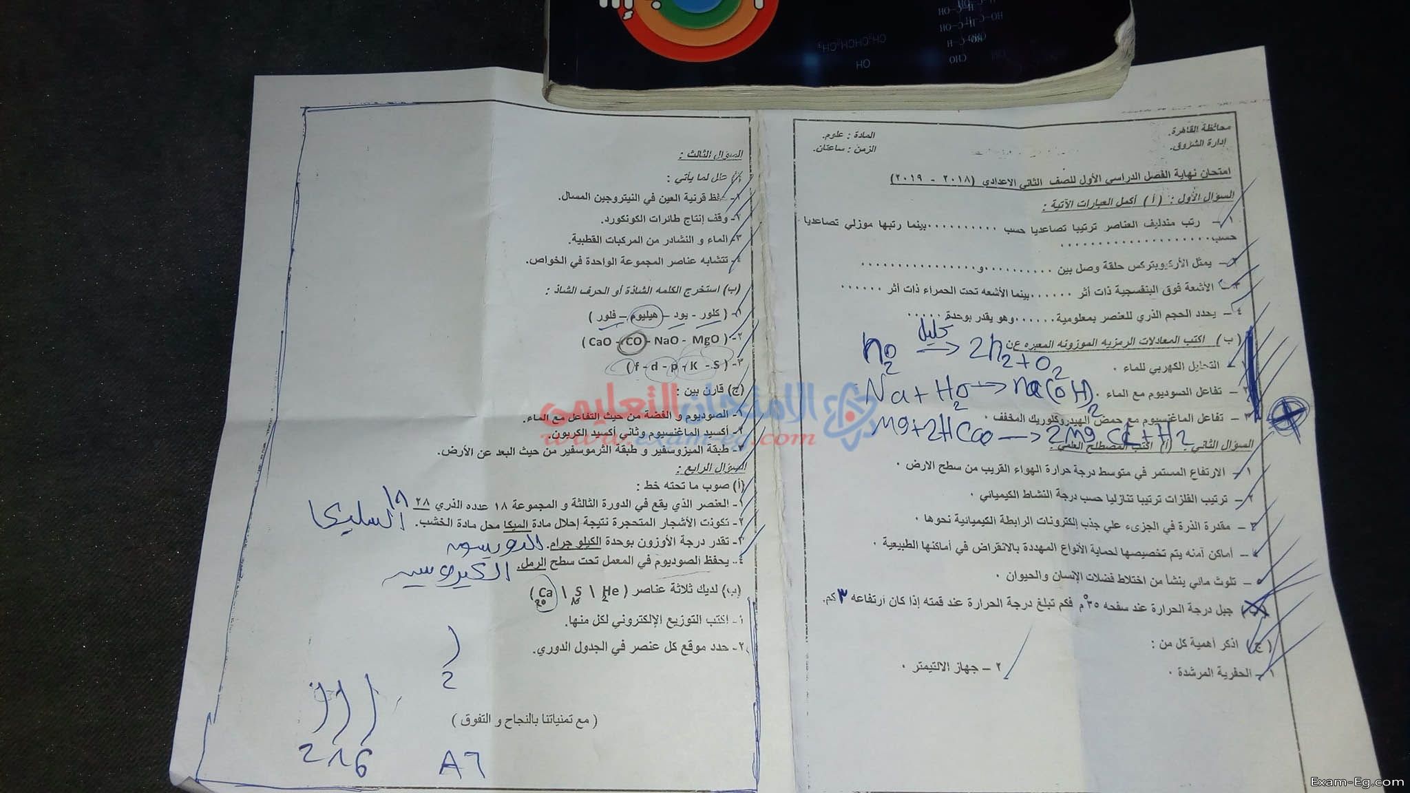 امتحان العلوم للصف الثانى الاعدادى الفصل الدراسي الاول 2019 ادارة الشروق بالقاهرة