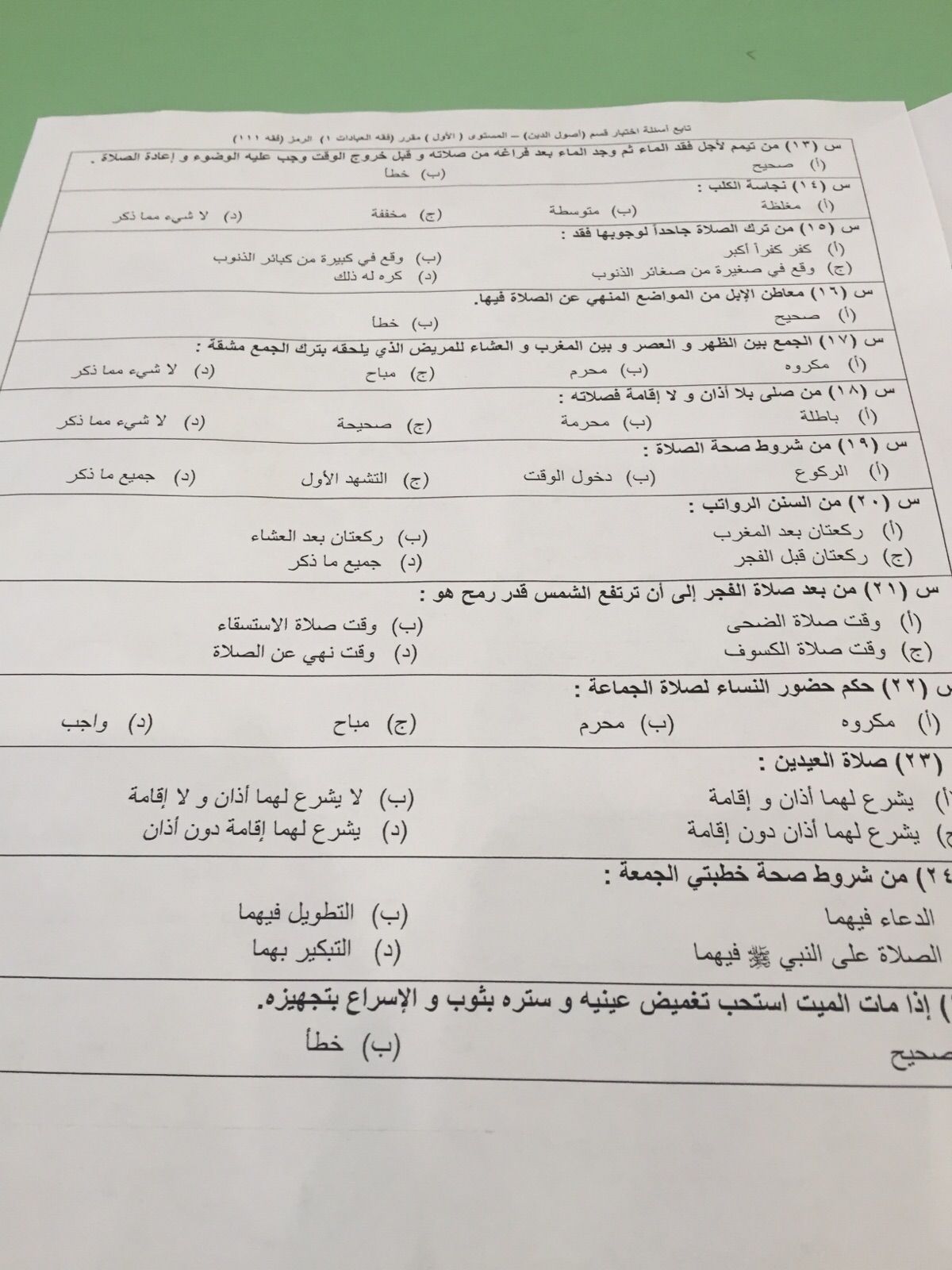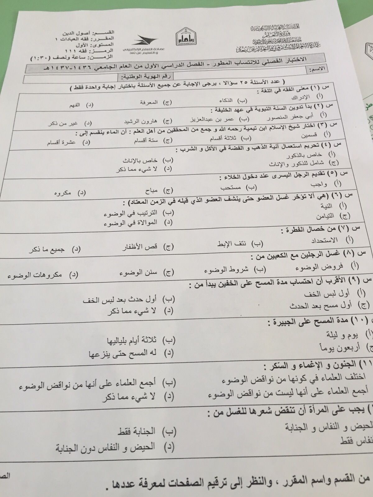 اسئلة اختبار فقه العبادات1 فقه 111 الفصل الاول 1437هـ
