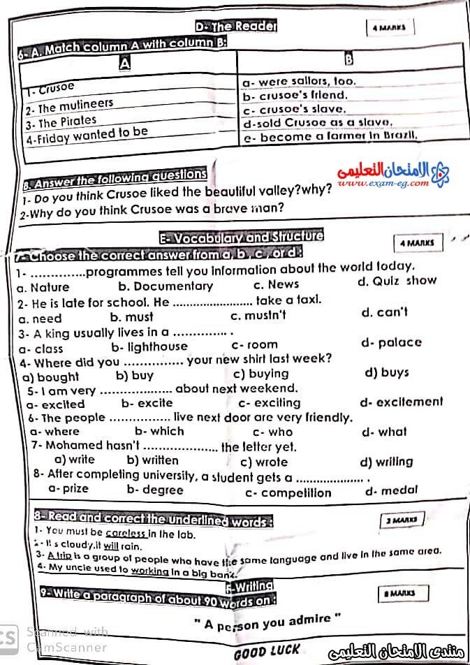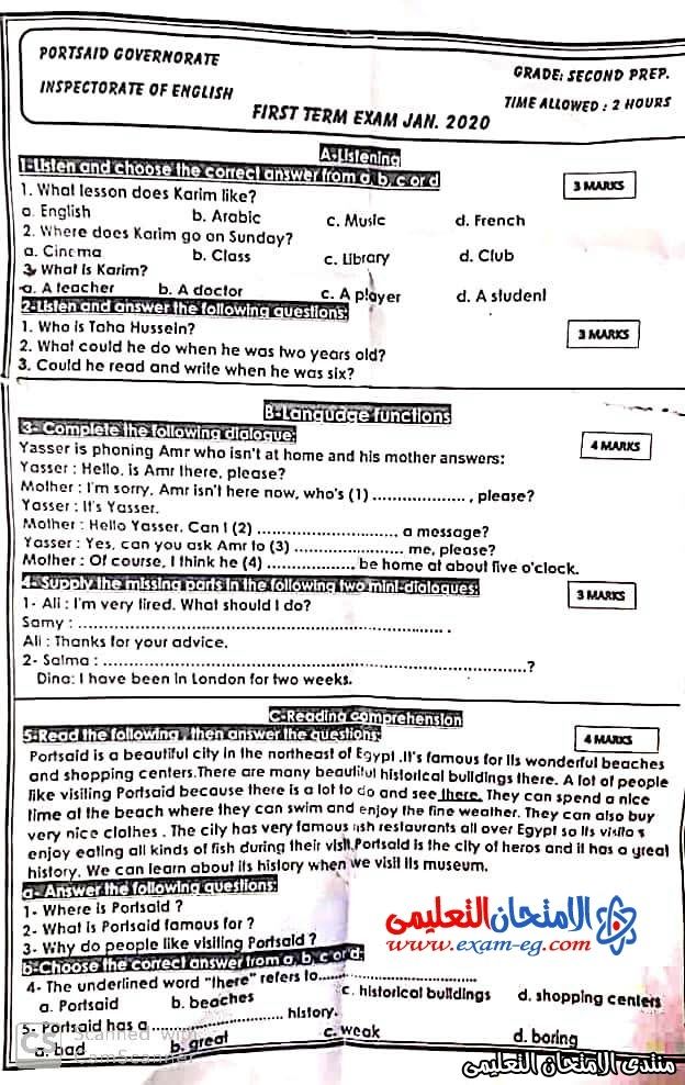 امتحان انجليزى تانية إعدادي الفصل الدراسي الأول 2020 محافظة بور سعيد