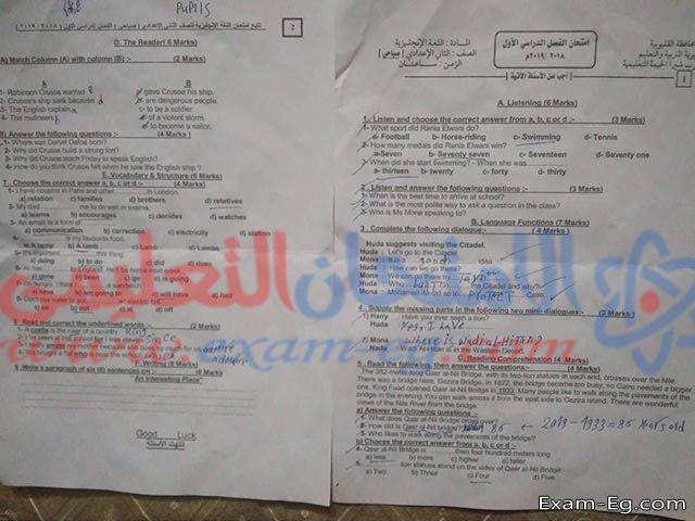 امتحان انجليزى تانية اعدادى الفصل الدراسي الاول 2019 محافظة القليوبية