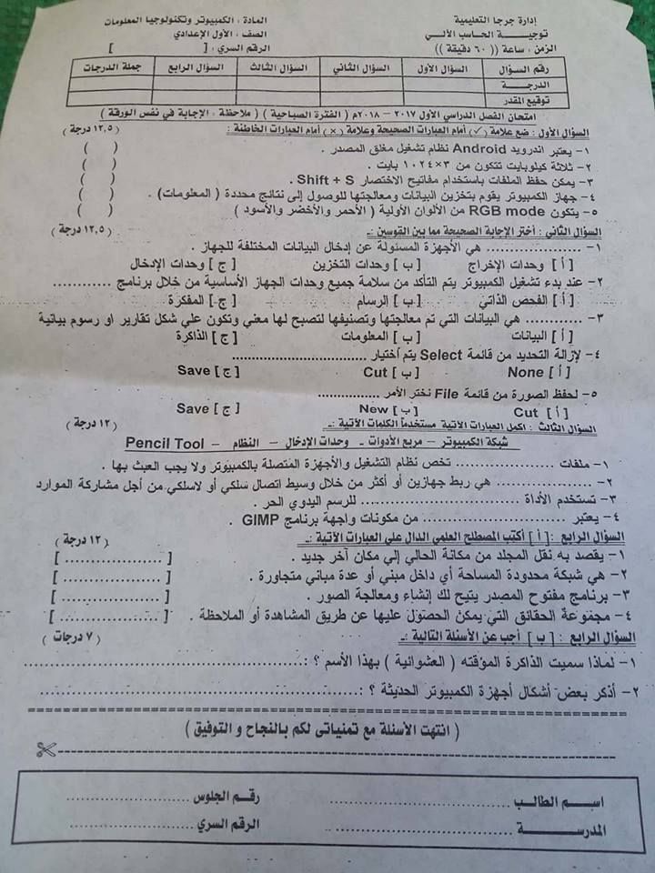 امتحان الكمبيوتر للصف الثانى الاعدادى الفصل الدراسي الاول 2018 ادارة جرجا بسوهاج