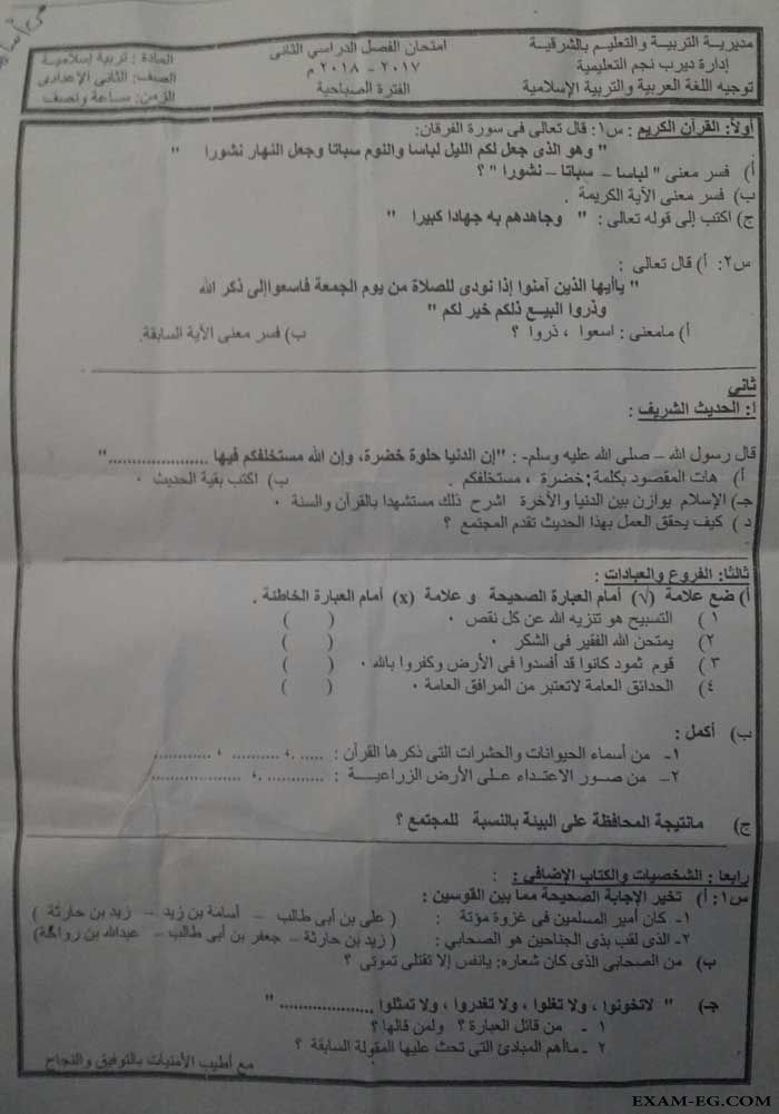 امتحان التربية الدينية الاسلامية للصف الثانى الاعدادى الفصل الدراسي الثانى 2018 ادارة ديرب نجم بالشرقية