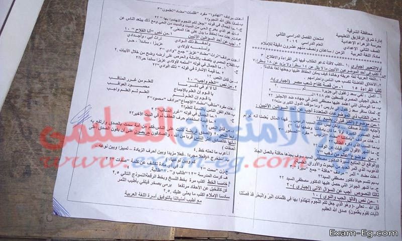 امتحان اللغة العربية للصف الثانى الاعدادى الفصل الدراسي الثانى 2019 ادارة شرق الزقازيق
