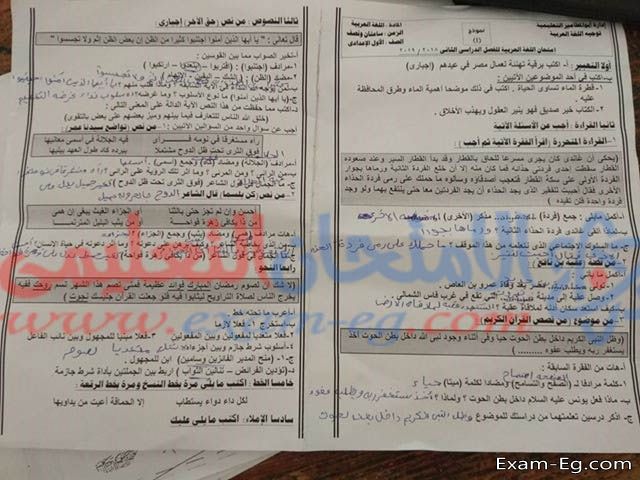 امتحان اللغة العربية للصف الثانى الاعدادى الفصل الدراسي الثانى 2019 ادارة ابو المطامير