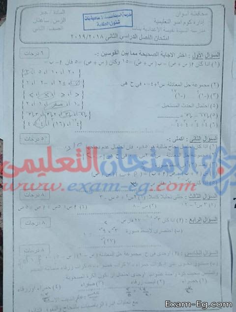 امتحان الجبر لتانية اعدادى الفصل الدراسي الثانى 2019 ادارة كوم امبو