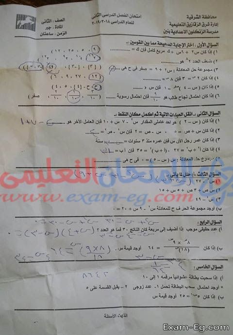 امتحان الجبر لتانية اعدادى الفصل الدراسي الثانى 2019 مدرسة الشبان المسلمين