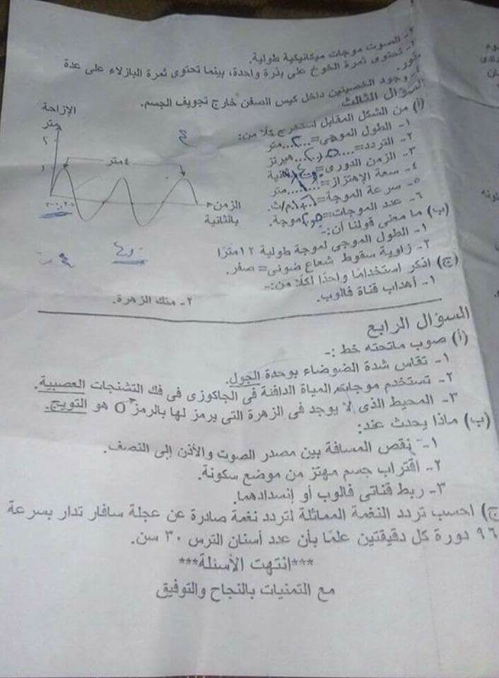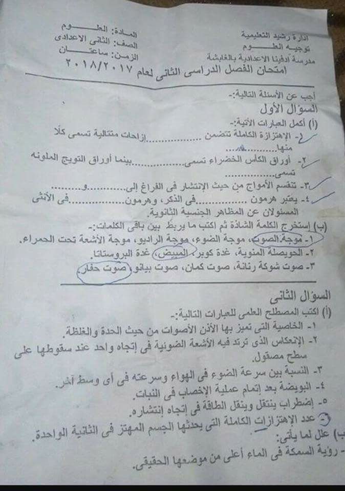 امتحان العلوم لتانية اعدادى الفصل الدراسى الثانى 2018 ادارة رشيد بالبحيرة