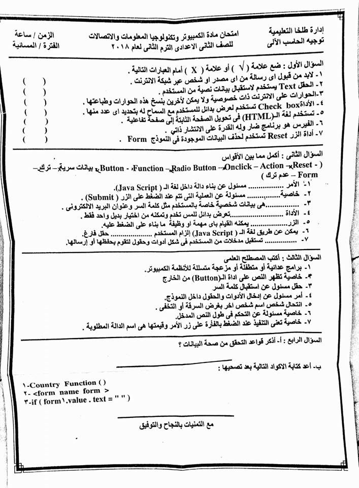 امتحان الكمبيوتر للثانية اعدادى الفصل الدراسى الثانى 2018 ادارة طلخا بالدقهلية