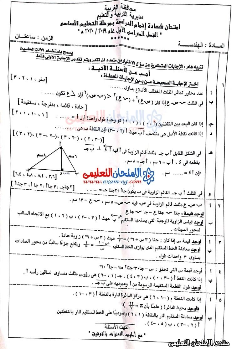 امتحان الهندسة الصف الثالث الإعدادي الفصل الدراسي الأول 2020 الغربية