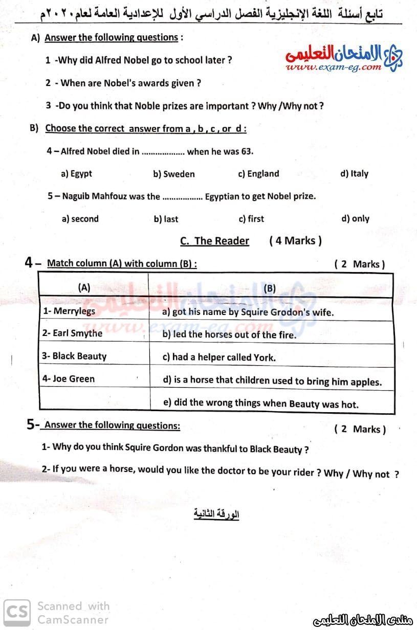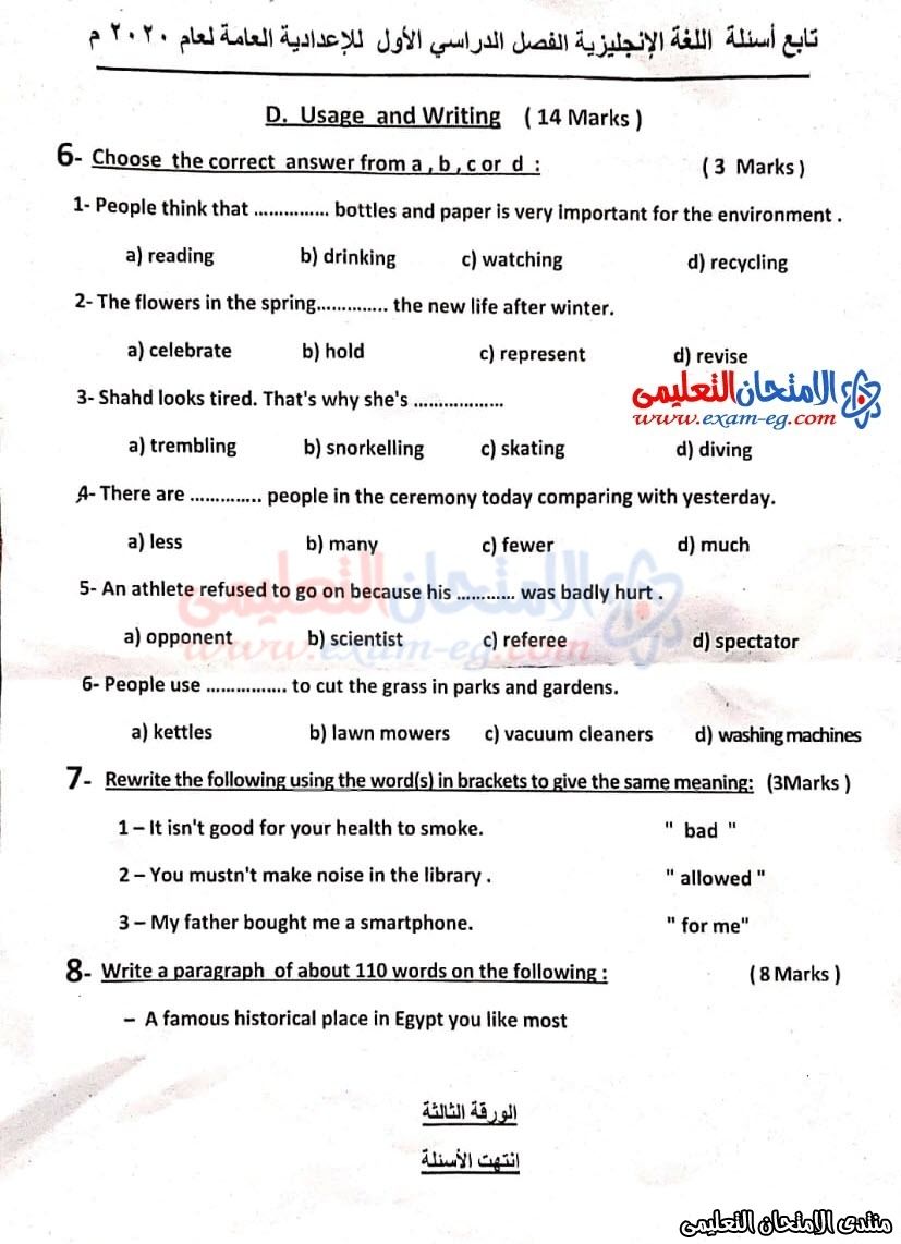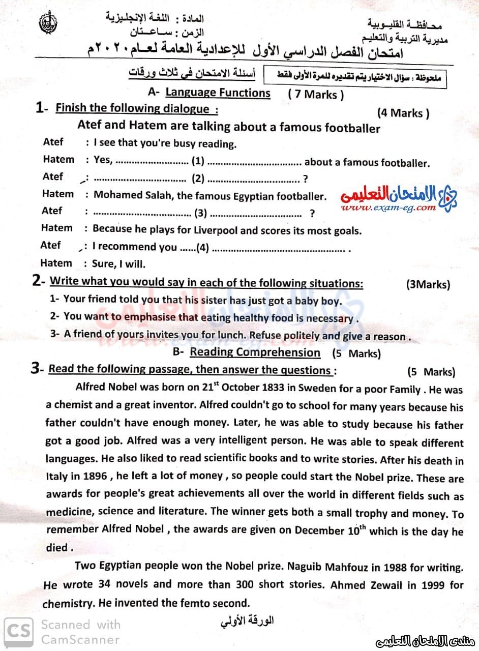 امتحان اللغة الانجليزية لثالثة اعدادى نصف العام 2020 القليوبية