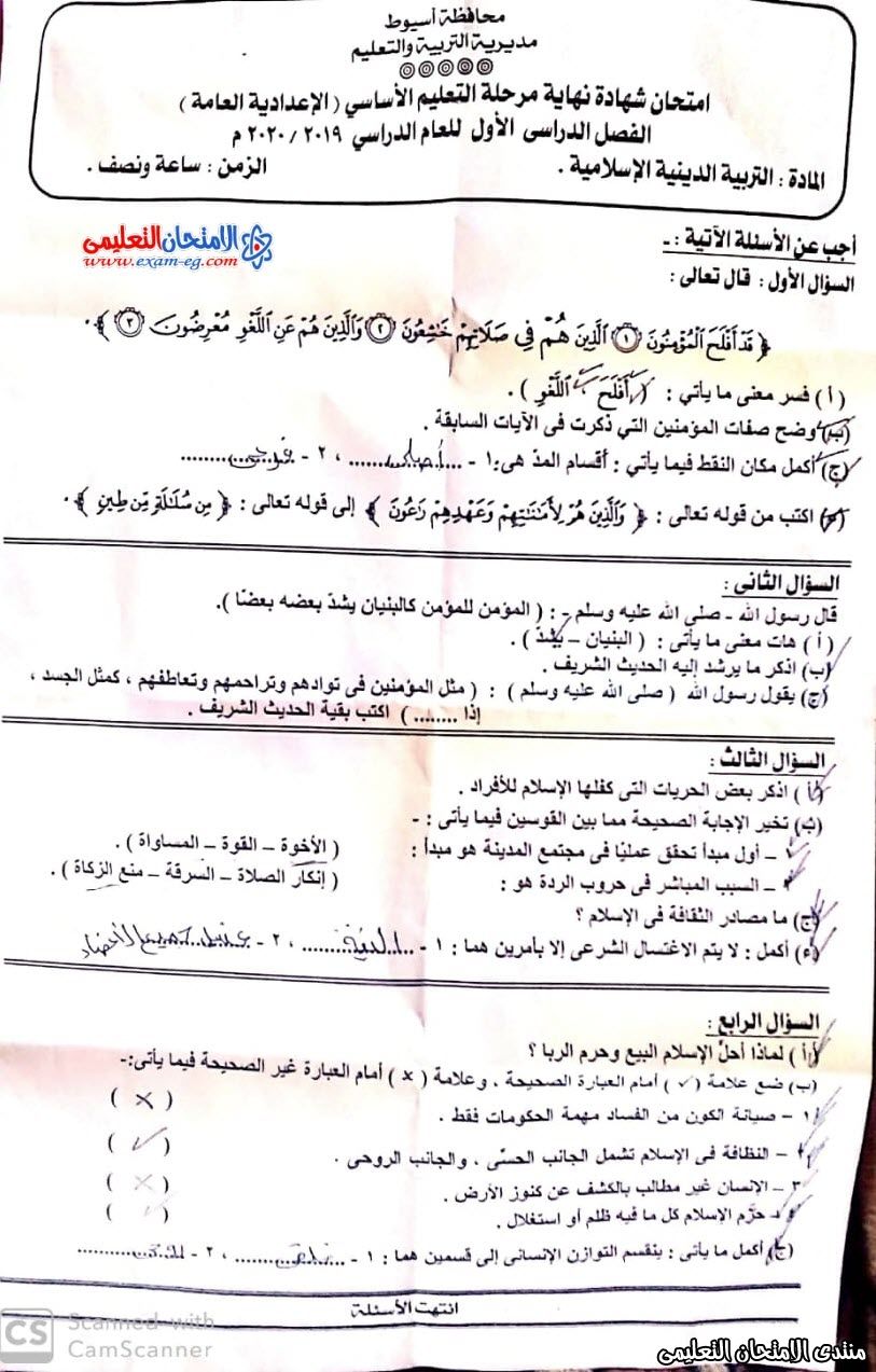 امتحان الدين الإسلامي لثالثة اعدادى نصف العام 2020 القليوبية