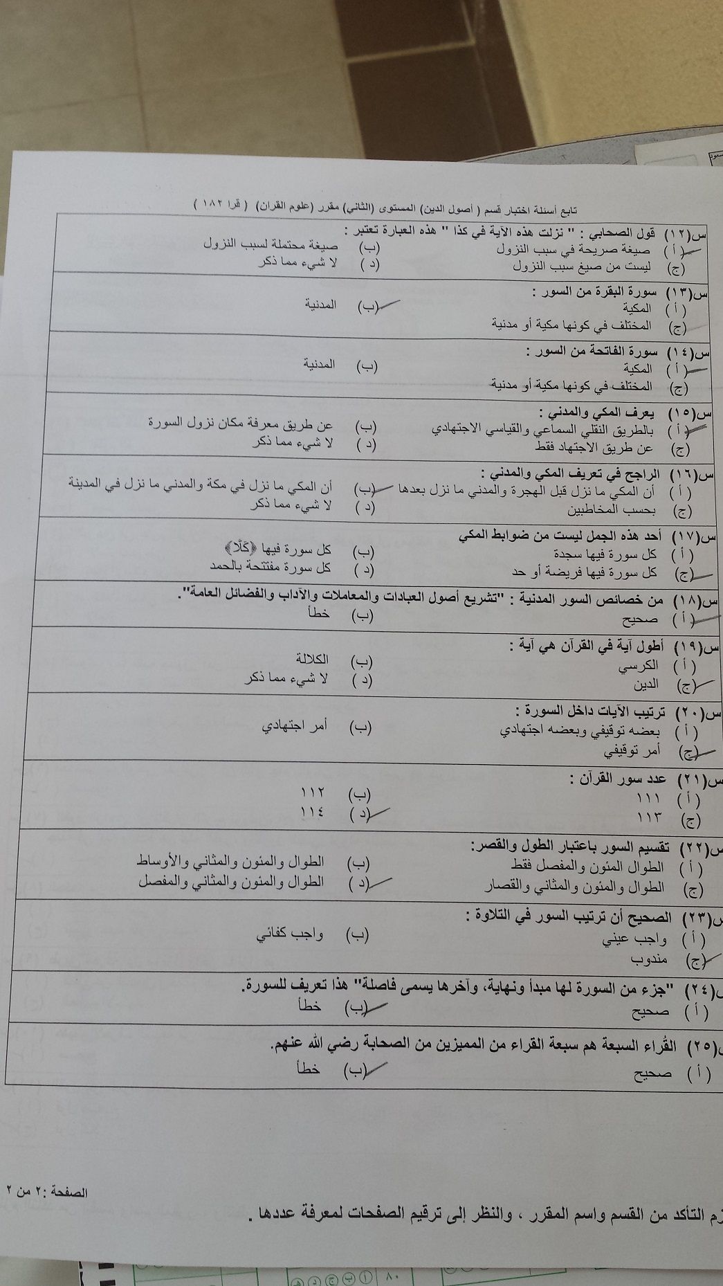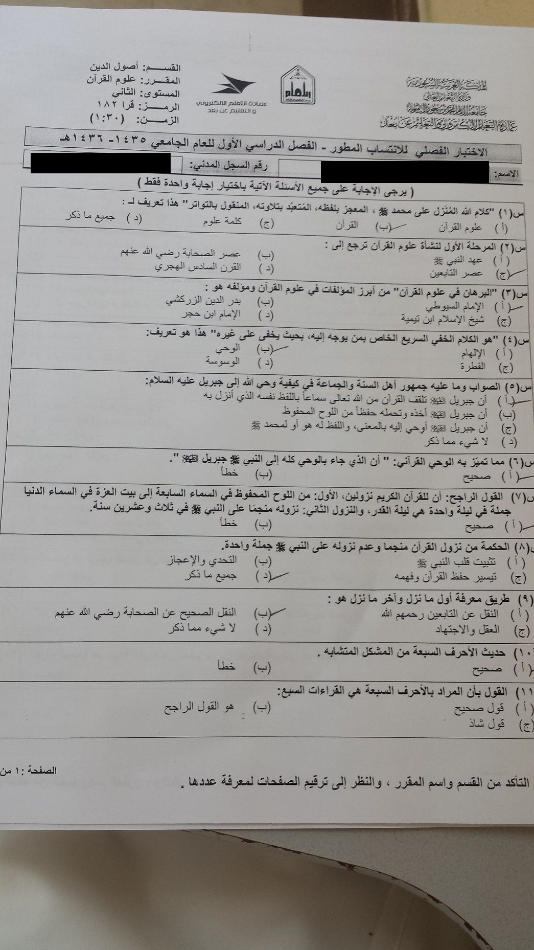 اسئلة اختبار علوم القرآن قرا 182 انتساب الفصل الدراسي الأول 1436هـ جامعة الإمام محمد بن سعود الإسلامية