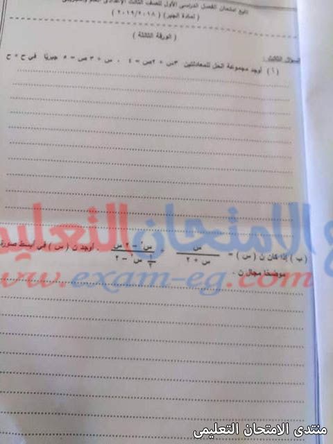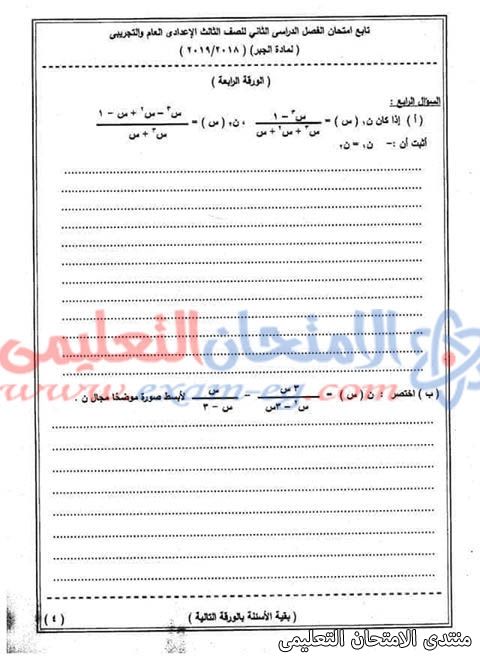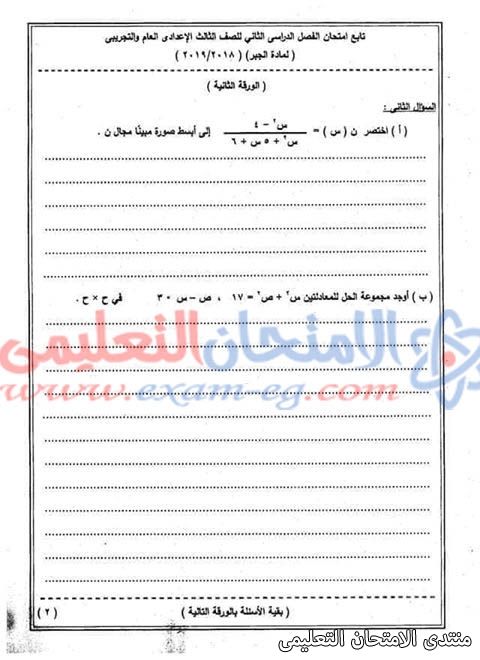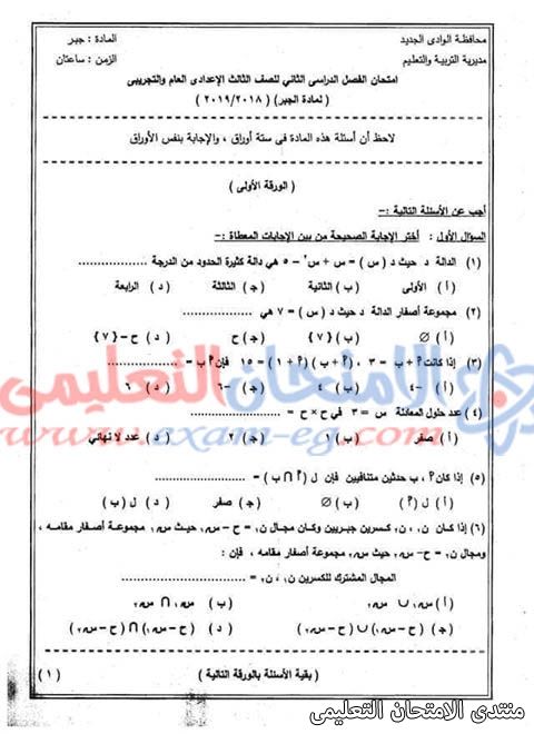 امتحان الجبر للثالث الاعدادى الفصل الدراسي الثانى 2019 محافظة الوادى الجديد