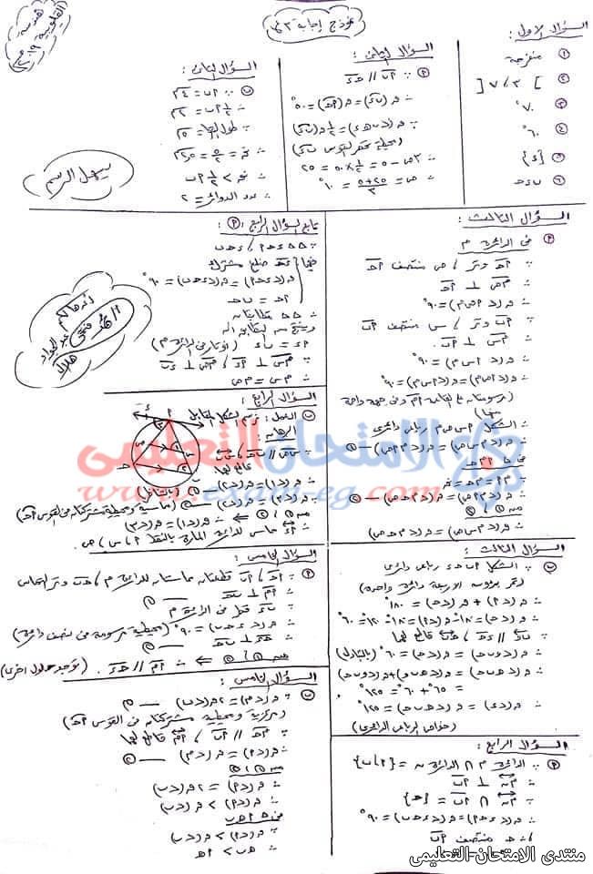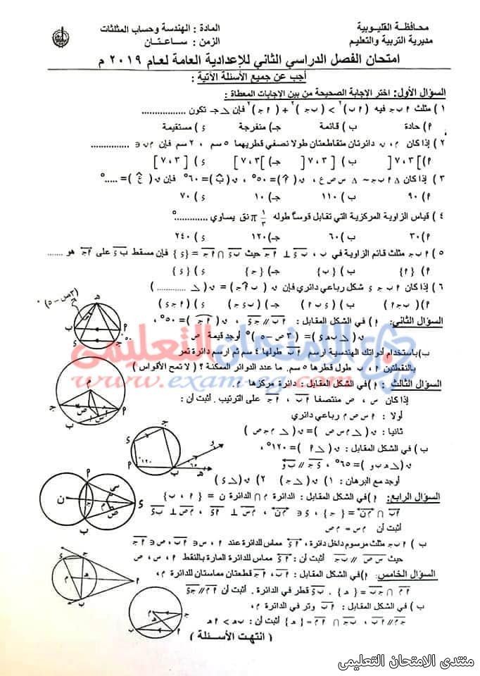امتحان الهندسة للثالث الاعدادى الفصل الدراسي الثانى 2019 محافظة القليوبية + الاجابة