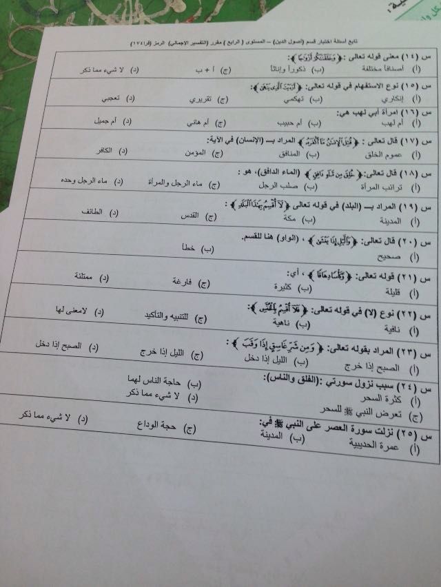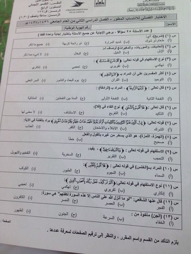اختبار التفسير الإجمالي قرا 174 الفصل الثاني 1437هـ