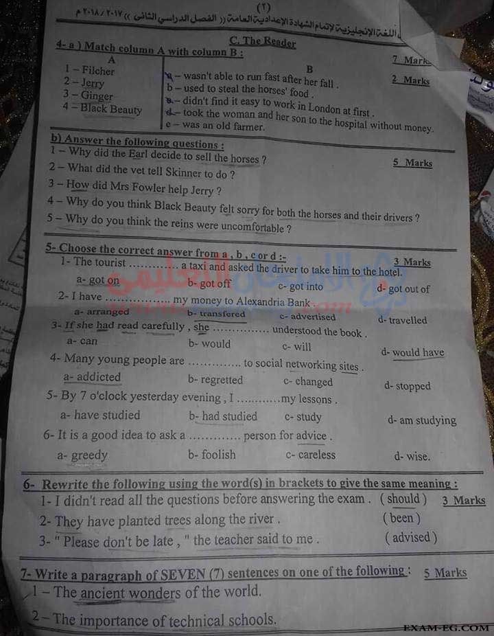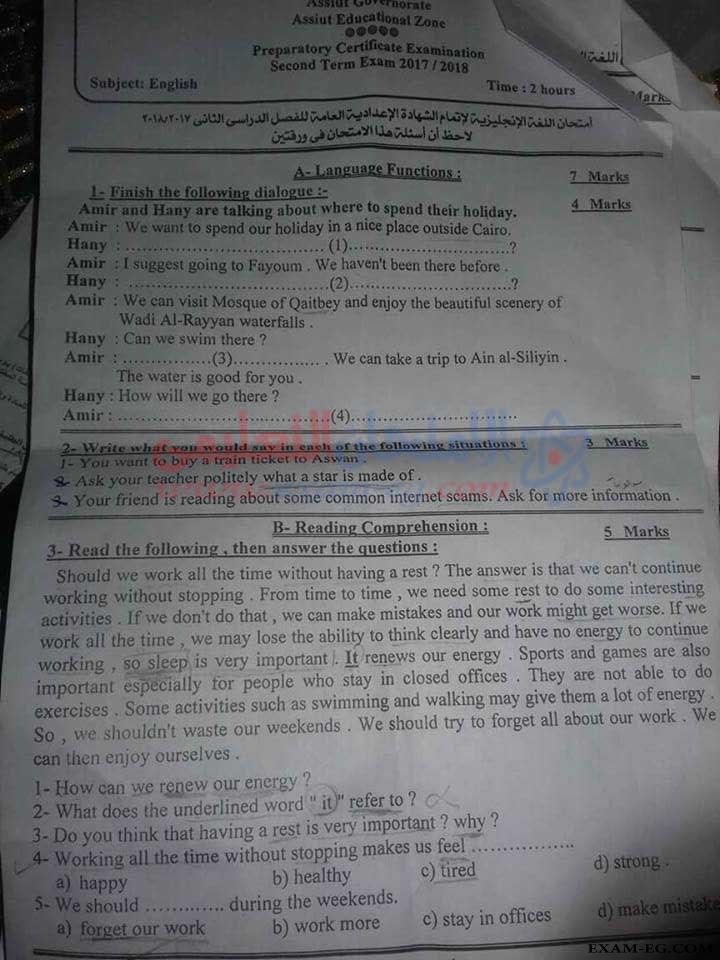 امتحان اللغة الانجليزية للصف الثالث الاعدادى الفصل الدراسي الثانى 2018 محافظة اسيوط