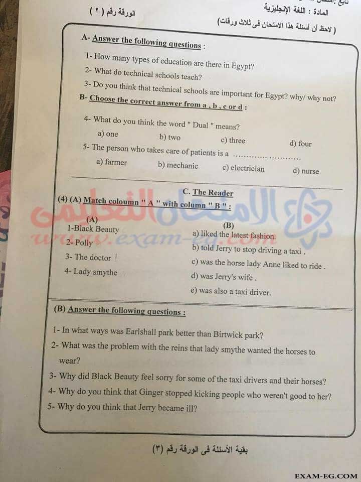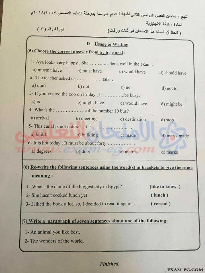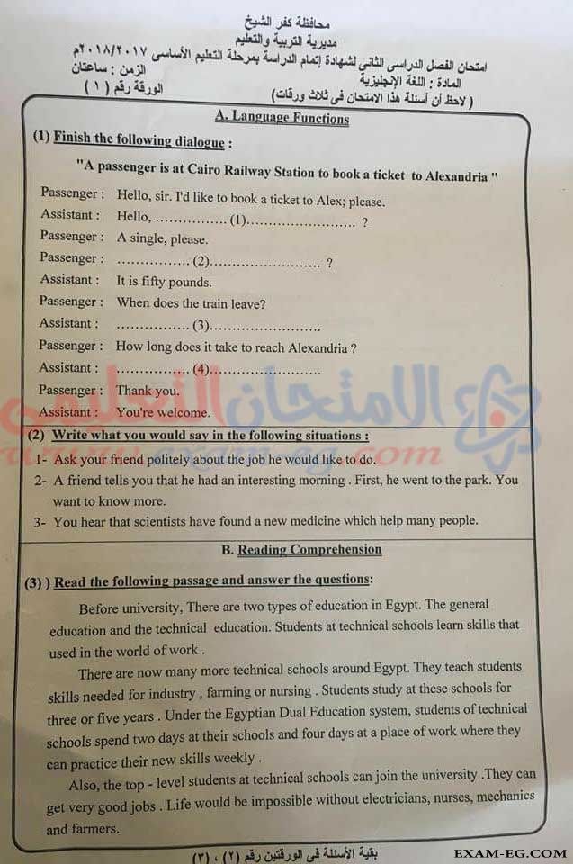 امتحان اللغة الانجليزية للصف الثالث الاعدادى الفصل الدراسي الثانى 2018 محافظة كفر الشيخ