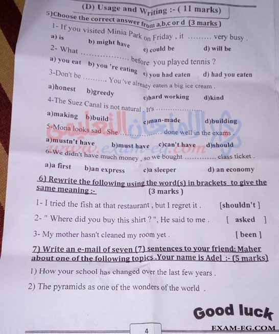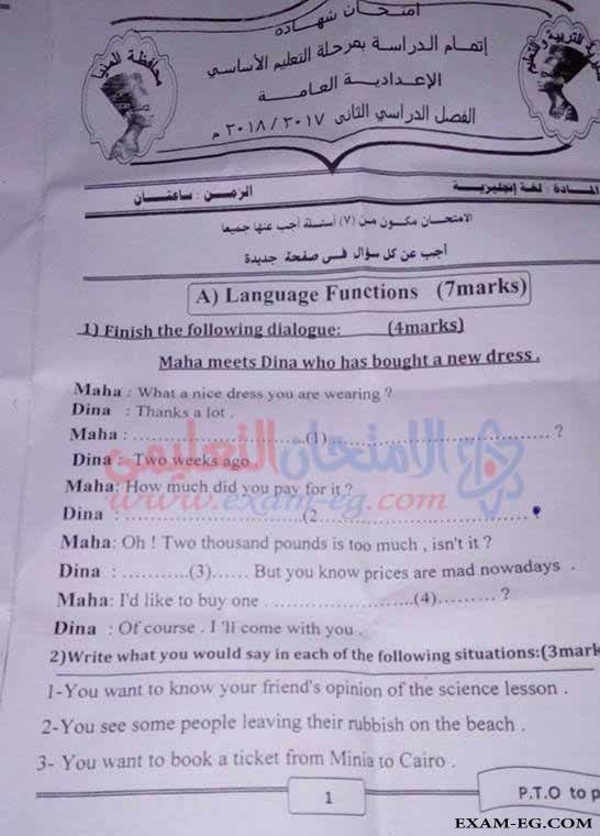 امتحان اللغة الانجليزية للصف الثالث الاعدادى الفصل الدراسي الثانى 2018 محافظة المنيا