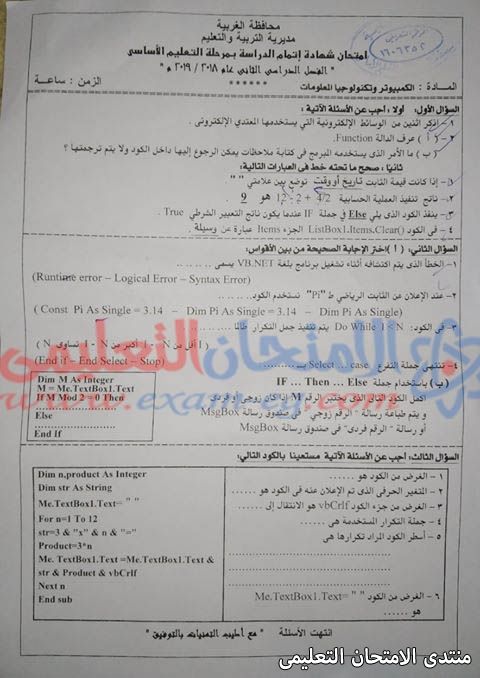 امتحان الكمبيوتر للثالث الاعدادى الترم الثانى 2019 محافظة الغربية