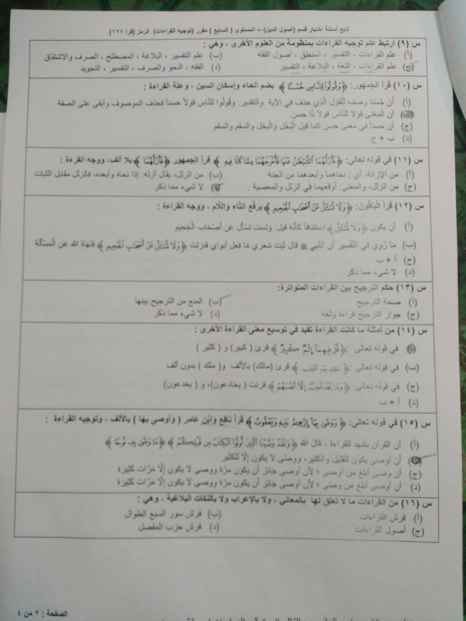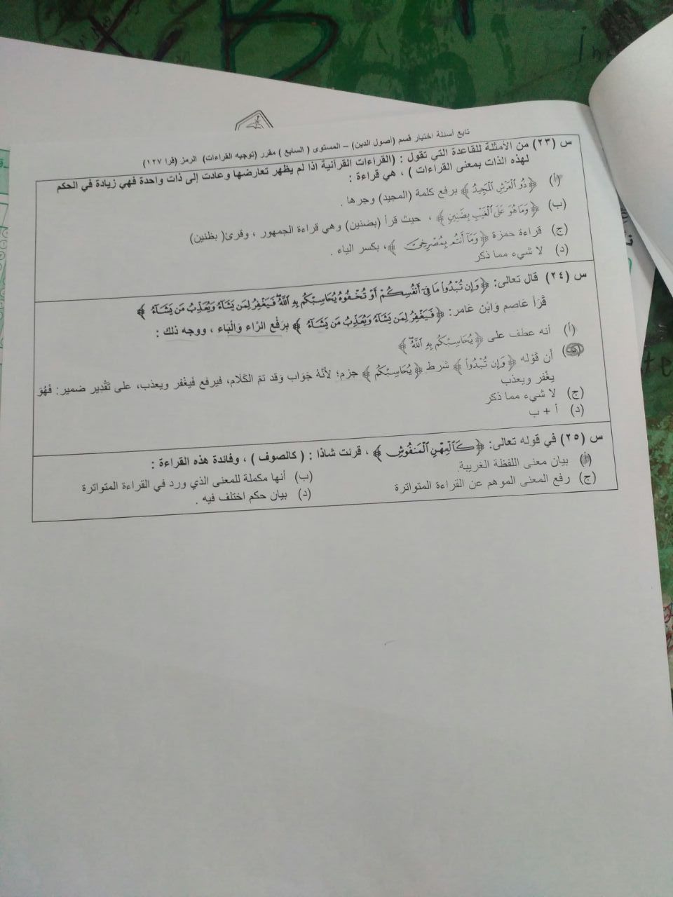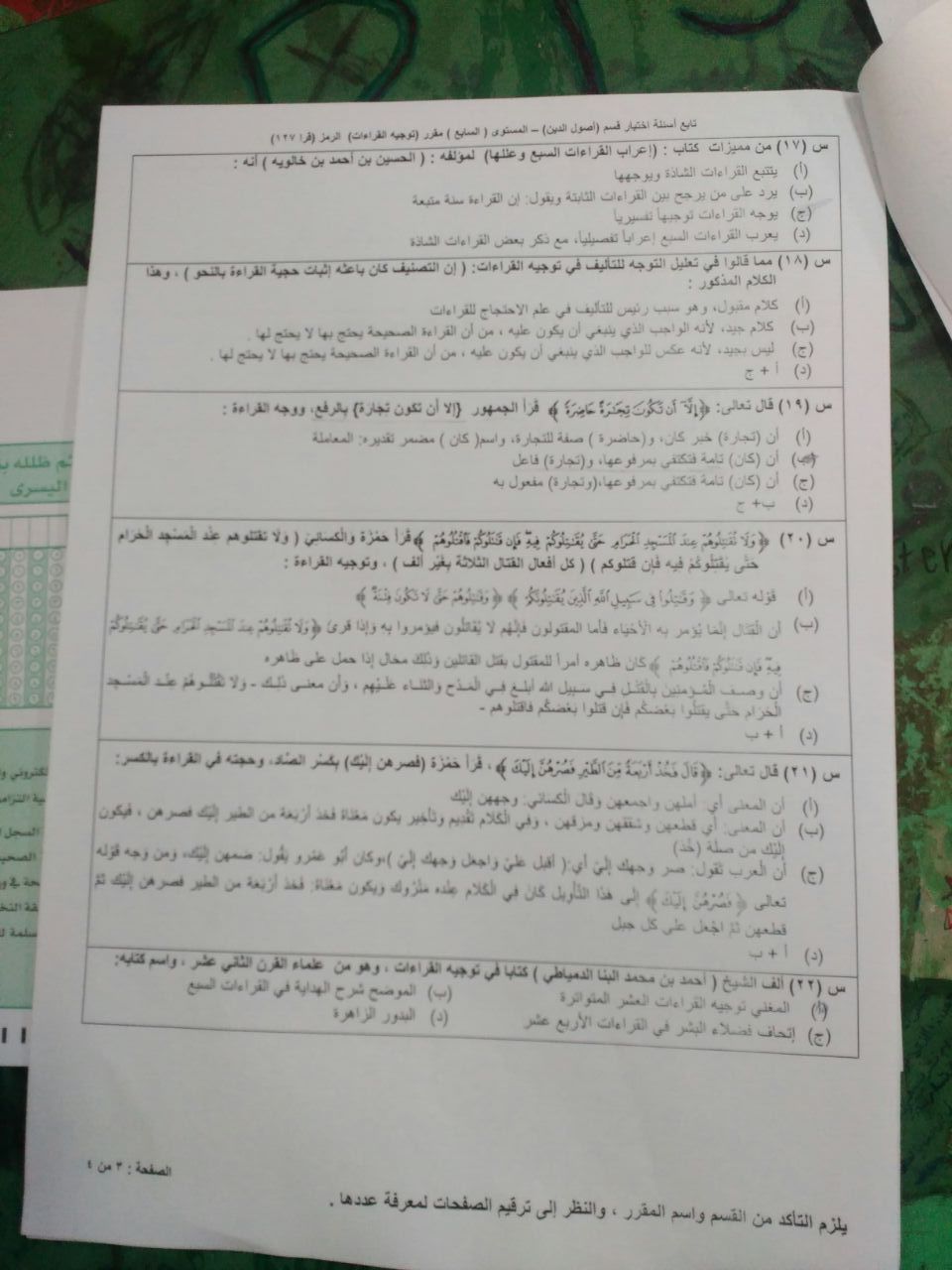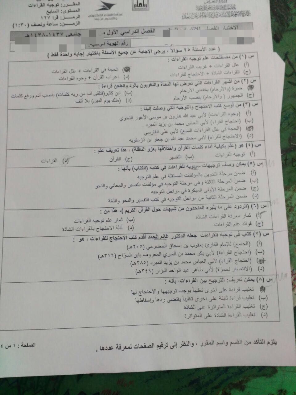 اختبار توجيه القراءات قرا 127 الفصل الأول 1438هـ