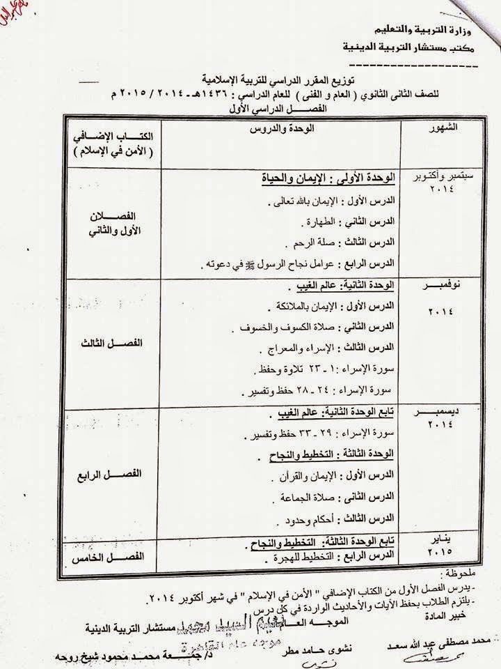 توزيع منهج التربية الإسلامية المطورة ثانى ثانوى الفصل الدراسي الأول
