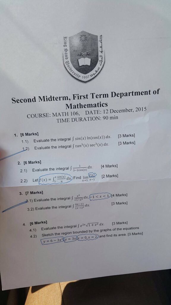 اسئلة اختبار الدوري الأول لمادة حساب التكامل ريض 106 الفصل الأول 1437هـ جامعة الملك سعود